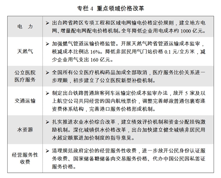 五是價(jià)格改革繼續(xù)深化。全面深化價(jià)格機(jī)制改革的意見出臺(tái)實(shí)施。持續(xù)推進(jìn)能源領(lǐng)域價(jià)格改革,完成首輪省級(jí)電網(wǎng)輸配電價(jià)改革,降低非居民用氣基準(zhǔn)門站價(jià)格,天然氣全產(chǎn)業(yè)鏈價(jià)格監(jiān)管制度基本建立。公立醫(yī)院藥品加成全部取消,公立醫(yī)療機(jī)構(gòu)特需等醫(yī)療服務(wù)定價(jià)穩(wěn)步放開。交通運(yùn)輸價(jià)格改革加快推進(jìn)。水資源價(jià)格改革穩(wěn)步推進(jìn)。