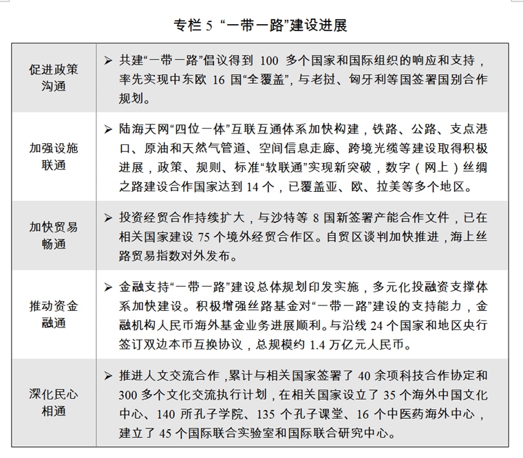 ?。┮浴耙粠б宦贰苯ㄔO(shè)為重點(diǎn),開放型經(jīng)濟(jì)新體制穩(wěn)步健全。著力提高“引進(jìn)來”水平,持續(xù)改善“走出去”結(jié)構(gòu),更深層次更高水平的全方位開放格局加快形成。