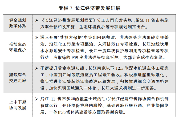 三是長(zhǎng)江經(jīng)濟(jì)帶發(fā)展取得積極進(jìn)展。全面落實(shí)《長(zhǎng)江經(jīng)濟(jì)帶發(fā)展規(guī)劃綱要》,省際合作協(xié)商機(jī)制有效運(yùn)行,“共抓大保護(hù)”格局初步形成。非法碼頭非法采砂整治、飲用水水源地安全檢查等專項(xiàng)行動(dòng)深入開展,負(fù)面清單、跨界斷面考核等生態(tài)環(huán)保制度建設(shè)加快推進(jìn),水環(huán)境治理、水生態(tài)修復(fù)和水資源保護(hù)等重大工程大力實(shí)施。綜合立體交通走廊加快建設(shè),上海、武漢、重慶三大航運(yùn)中心建設(shè)進(jìn)展順利,滬蓉、滬渝、滬昆高速公路全線通車。