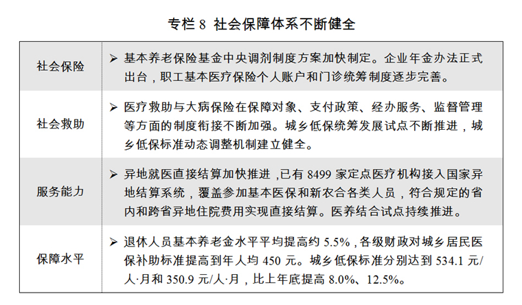二是社會(huì)保障體系不斷健全。養(yǎng)老保險(xiǎn)制度頂層設(shè)計(jì)取得關(guān)鍵性進(jìn)展,劃轉(zhuǎn)部分國(guó)有資本充實(shí)社?;饘?shí)施方案印發(fā)實(shí)施。城鄉(xiāng)居民基本醫(yī)療保險(xiǎn)制度整合深入推進(jìn),異地就醫(yī)直接結(jié)算取得重要突破,所有省級(jí)異地就醫(yī)結(jié)算系統(tǒng)、所有統(tǒng)籌地區(qū)均與國(guó)家異地就醫(yī)結(jié)算系統(tǒng)實(shí)現(xiàn)對(duì)接。高齡津貼制度已在全國(guó)31個(gè)省份和新疆生產(chǎn)建設(shè)兵團(tuán)實(shí)現(xiàn)全覆蓋。城鎮(zhèn)職工基本養(yǎng)老和城鄉(xiāng)居民養(yǎng)老保險(xiǎn)參保人數(shù)分別達(dá)到4.02億人和5.13億人。城鎮(zhèn)棚戶區(qū)住房改造開工609萬套。