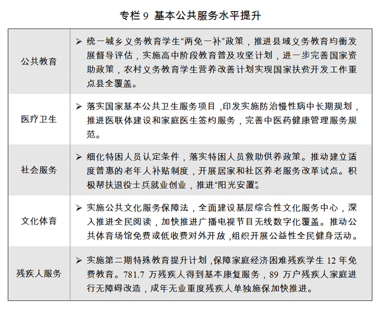 三是不斷增強(qiáng)公共產(chǎn)品和服務(wù)供給能力。進(jìn)一步提高基本公共服務(wù)均等化水平,制定基本公共服務(wù)標(biāo)準(zhǔn)體系指導(dǎo)意見。堅(jiān)持教育優(yōu)先發(fā)展,深化教育領(lǐng)域綜合改革,促進(jìn)城鄉(xiāng)義務(wù)教育一體化發(fā)展,持續(xù)改善薄弱學(xué)校基本辦學(xué)條件,著力解決中小學(xué)生課外負(fù)擔(dān)重、“擇校熱”、“大班額”等突出問題。多渠道增加學(xué)前教育資源供給,加強(qiáng)嬰幼兒照護(hù)和兒童早期教育服務(wù)。推進(jìn)普及高中階段教育。深化產(chǎn)教融合,拓寬社會(huì)力量舉辦職業(yè)教育空間,擴(kuò)大企業(yè)新型學(xué)徒制和現(xiàn)代學(xué)徒制試點(diǎn)。加快“雙一流”建設(shè)。發(fā)展民族教育、特殊教育、繼續(xù)教育和網(wǎng)絡(luò)教育。加強(qiáng)師資隊(duì)伍和師德師風(fēng)建設(shè)。2018年,九年義務(wù)教育鞏固率預(yù)期目標(biāo)達(dá)到94.2%,高中階段教育毛入學(xué)率預(yù)期目標(biāo)達(dá)到88.9%,普通高等教育本??普猩A(yù)期目標(biāo)達(dá)到755萬人。深入實(shí)施健康中國(guó)戰(zhàn)略,提升全民健康素質(zhì)。深化醫(yī)藥衛(wèi)生體制改革,推進(jìn)分級(jí)診療,加強(qiáng)基層醫(yī)療衛(wèi)生服務(wù)體系和全科醫(yī)生、兒科醫(yī)生隊(duì)伍建設(shè),實(shí)施新一輪改善醫(yī)療服務(wù)計(jì)劃,提升疑難病癥診治能力,健全藥品供應(yīng)保障制度,支持中醫(yī)藥事業(yè)傳承創(chuàng)新發(fā)展。推進(jìn)實(shí)施食品安全戰(zhàn)略。全面放開養(yǎng)老服務(wù)市場(chǎng),推進(jìn)醫(yī)養(yǎng)結(jié)合,大力推進(jìn)實(shí)施社會(huì)服務(wù)兜底工程。切實(shí)加強(qiáng)婦女、未成年人、殘疾人等社會(huì)群體權(quán)益保護(hù),健全農(nóng)村留守兒童和婦女、老年人關(guān)愛服務(wù)體系,加快推進(jìn)無障礙環(huán)境建設(shè)。推動(dòng)實(shí)施國(guó)家人口發(fā)展規(guī)劃,研究制定國(guó)家積極應(yīng)對(duì)人口老齡化中長(zhǎng)期規(guī)劃,進(jìn)一步完善全面兩孩配套政策,健全人口預(yù)測(cè)預(yù)報(bào)預(yù)警機(jī)制。完善公共服務(wù)法律體系。貫徹落實(shí)公共文化服務(wù)保障法,構(gòu)建現(xiàn)代公共文化服務(wù)體系,實(shí)施文化惠民工程,推進(jìn)基層綜合性文化服務(wù)中心建設(shè),扎實(shí)推進(jìn)國(guó)家圖書館國(guó)家文獻(xiàn)戰(zhàn)略儲(chǔ)備庫等國(guó)家級(jí)重點(diǎn)文化項(xiàng)目建設(shè)。深入推進(jìn)中華優(yōu)秀傳統(tǒng)文化傳承發(fā)展。繁榮發(fā)展哲學(xué)社會(huì)科學(xué),建好中國(guó)特色新型智庫。實(shí)施全民健身計(jì)劃,加強(qiáng)公共體育設(shè)施建設(shè)和利用,加快發(fā)展體育產(chǎn)業(yè)。嚴(yán)格落實(shí)安全生產(chǎn)責(zé)任制,推進(jìn)防災(zāi)減災(zāi)救災(zāi)體制機(jī)制改革,加強(qiáng)社區(qū)治理體系建設(shè),健全公共安全體系。