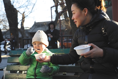 代女士已經(jīng)連續(xù)13年來雍和宮喝臘八粥了。她說,自己懷孕時偶然趕上雍和宮舍粥,因?yàn)樽约菏歉啐g產(chǎn)婦,許愿“母子平安”。隨后每年臘八她都帶上家人來喝上一碗粥,今年恰逢周末,她就帶上兒子一起來,“參與這個節(jié)日已經(jīng)成了我們家的傳統(tǒng),每年來這里祈福納祥?!保ㄓ浾?張彤 攝影/記者 王飛)