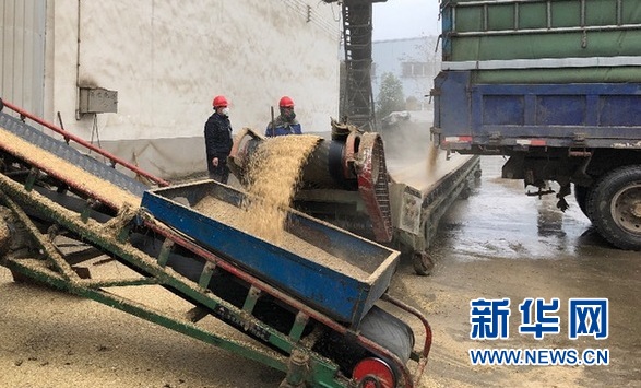 圖為安徽省鳳陽縣鳳臨糧貿(mào)有限公司卸糧現(xiàn)場(chǎng)。新華網(wǎng)汪亞/攝