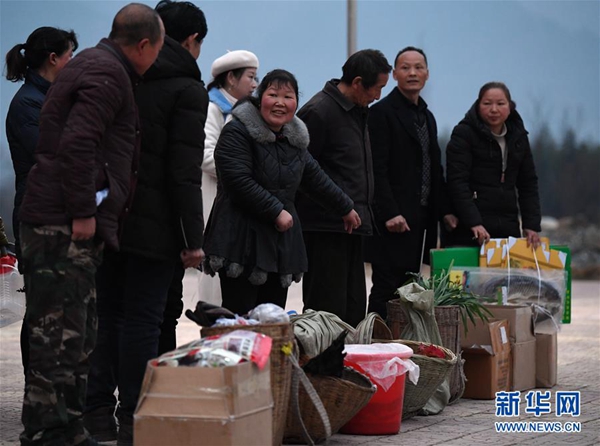 1月24日,家住漢中市寧強(qiáng)縣大安鎮(zhèn)的邵艷紅(右四)在寧強(qiáng)站同其他等車賣貨的村民聊天。 新華社記者 張博文 攝