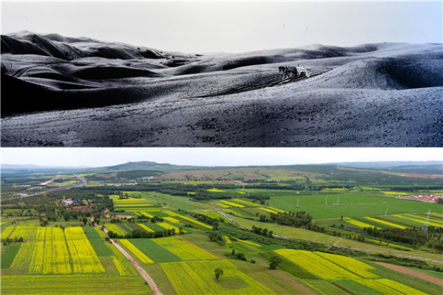 上圖為治理前,山西省右玉縣隨處可見半流動沙丘(資料照片);下圖為山西省右玉縣威遠鎮(zhèn)治理后的荒沙地,如今已郁郁蔥蔥。(新華社記者詹彥攝·2017年)
