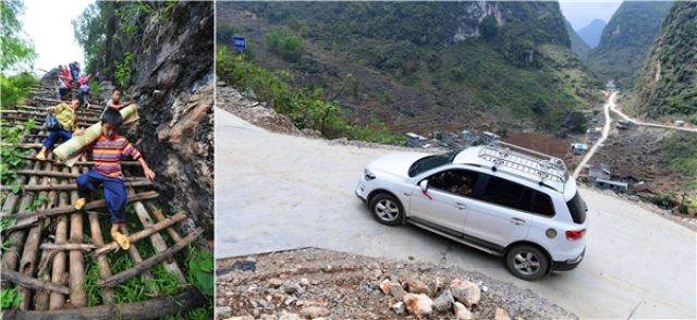 右圖:修通水泥路之后,弄頂屯的家長開著汽車去學校接孩子回家。(新華社記者黃孝邦攝·2017年)。
