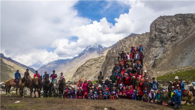 2017年7月21日,喀拉塔什其木干村村民在夏牧場合影。(新華社記者江文耀攝·2017年)