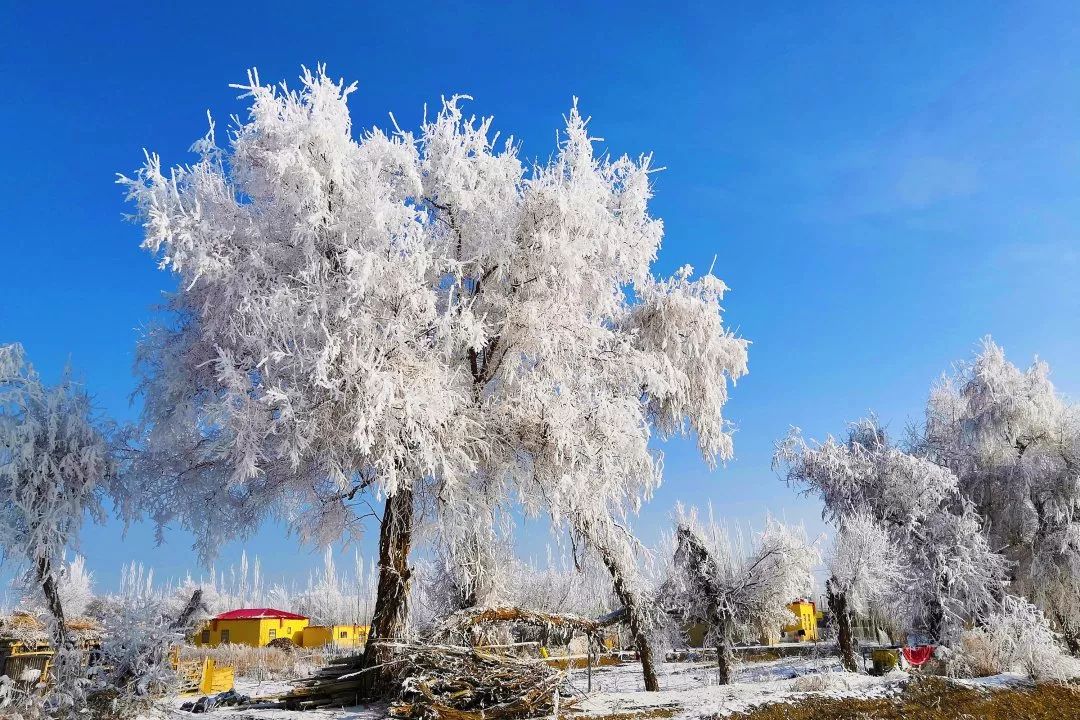 2019-1-27,新疆和田地區(qū)民豐縣安迪爾鄉(xiāng)。塔克拉瑪干沙漠中,胡楊身披雪白晶瑩的霧凇,小村莊安迪爾像童話般的存在!作者:左永江