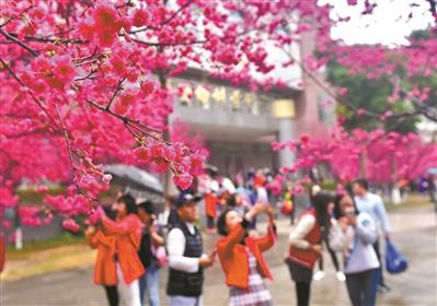 華南農(nóng)業(yè)大學內的櫻花盛開,引來不少市民賞花拍花。記者廖雪明 攝