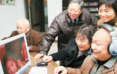家住杭州的張淼林夫婦通過網(wǎng)絡(luò)視頻和美國的兒子一家通話,6歲的孫女在網(wǎng)上給爺爺奶奶拜年。資料圖片