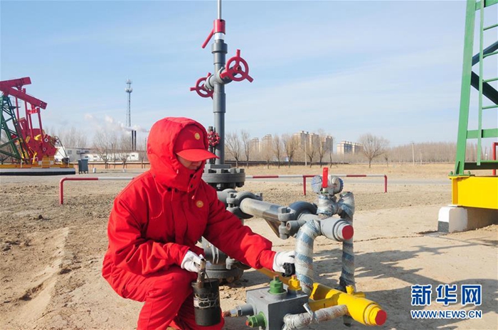 大慶油田中四采油隊(duì)采油工秦梅在巡查采油“磕頭機(jī)”(2月3日攝)。新華社記者 管建濤 攝