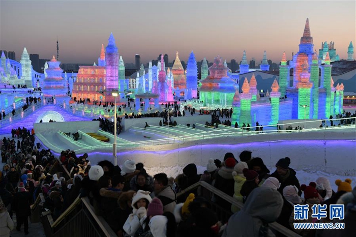 游客在哈爾濱冰雪大世界園區(qū)排隊(duì)體驗(yàn)冰雪娛樂項(xiàng)目(1月5日攝)。新華社記者 王建威 攝