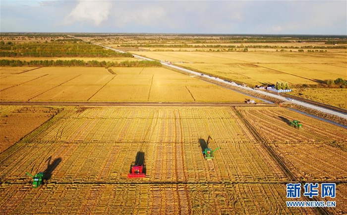 大型農(nóng)機(jī)在黑龍江省三江平原上收割水稻(2017年9月28日無人機(jī)拍攝)。新華社記者 王建威 攝