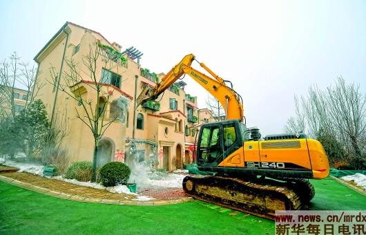 ▲2月19日,大型機(jī)械在拆除石家莊市鹿泉區(qū)“西美金山湖”房地產(chǎn)項(xiàng)目違規(guī)別墅。本報記者王曉攝