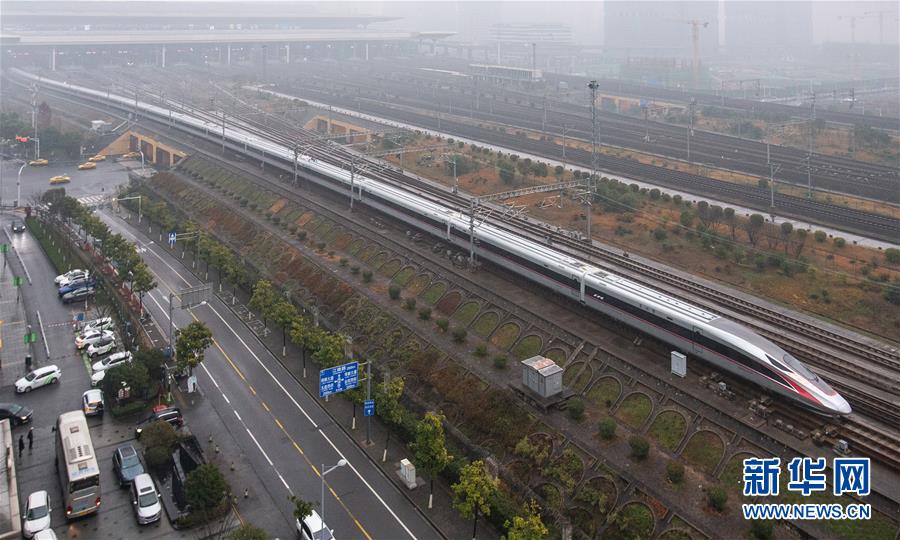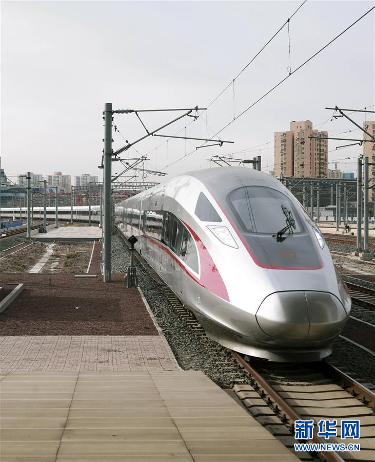 1月5日,G9次超長(zhǎng)版“復(fù)興號(hào)”動(dòng)車(chē)組列車(chē)駛?cè)肽暇┠险尽P氯A社發(fā)(蘇陽(yáng) 攝)