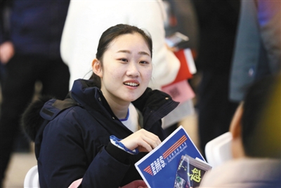 昨日,北京春季國(guó)展人才招聘會(huì)上,一名來應(yīng)聘的女士在與用人單位洽談。圖/視覺中國(guó)