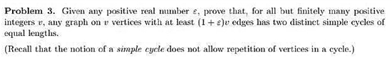 讓中國隊(duì)全軍覆沒的第3題,翻譯過來的大致意思是:給定任何一個(gè)正實(shí)數(shù)e,證明除了有限個(gè)正整數(shù)以外的所有正整數(shù)v,任何有v個(gè)頂點(diǎn)并且有大于等于 (1+e)v條邊的圖至少包含兩個(gè)不同的等長簡單回路。