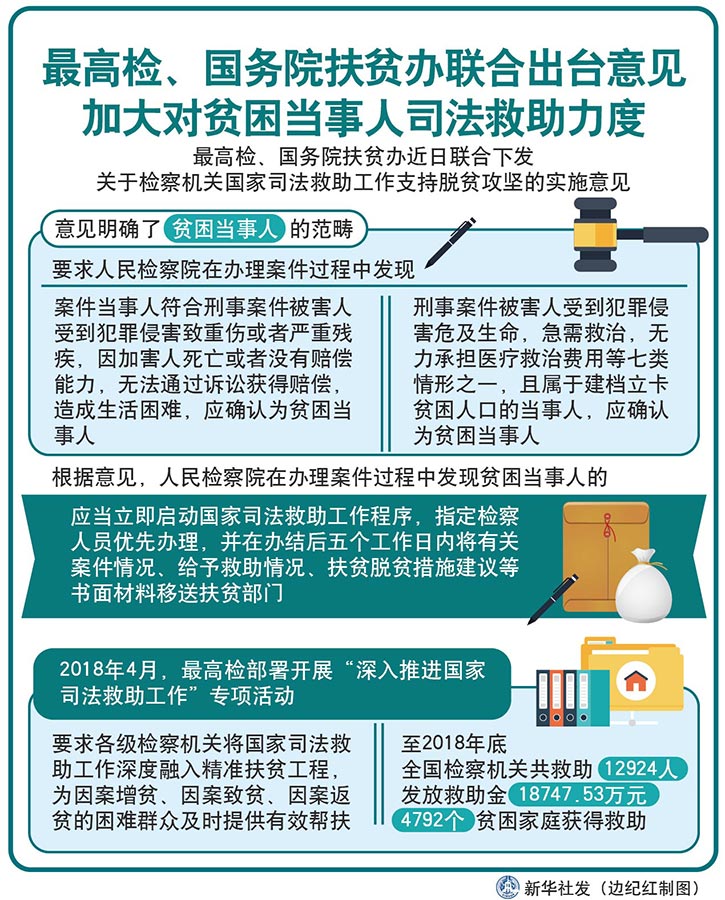 圖表:最高檢、國務(wù)院扶貧辦聯(lián)合出臺意見 加大對貧困當(dāng)事人司法救助力度 新華社發(fā) 邊紀(jì)紅 制圖