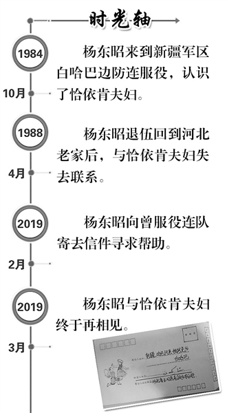 隨著時(shí)間的推移,楊東昭這個(gè)當(dāng)年20歲的小伙子如今已年過半百,雖然日子過得越來越紅火,但內(nèi)心對(duì)兩位哈薩克族老人的思念越發(fā)強(qiáng)烈。在千家萬戶團(tuán)聚歡樂的鞭炮聲中,他提筆寫了一封信寄到曾經(jīng)服役的連隊(duì)尋求幫助。