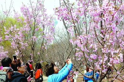 玉淵潭公園的杭州早櫻綻放枝頭,游客紛紛拍照留念。北京日報(bào)記者 吳鏑攝