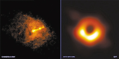 左圖 錢德拉X射線望遠(yuǎn)鏡與事件視界望遠(yuǎn)鏡同時(shí)拍攝的照片,顯示了M87星系中心黑洞的“相對(duì)論性噴流”。右圖 事件視界望遠(yuǎn)鏡拍攝的M87星系中心黑洞圖像。圖片來源:美國(guó)趣味科學(xué)網(wǎng)站
