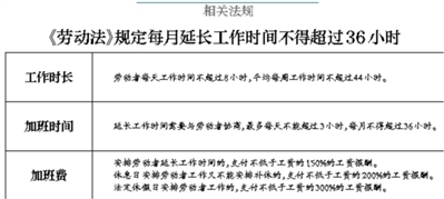 京衡律師上海事務(wù)所余超律師對(duì)北青報(bào)記者表示,根據(jù)法律,勞動(dòng)者每天工作時(shí)間不超過(guò)8小時(shí),平均每周工作時(shí)間不超過(guò)44小時(shí);延長(zhǎng)工作時(shí)間需要與勞動(dòng)者協(xié)商,最多每天不能超過(guò)3小時(shí),每月不得超過(guò)36小時(shí)。并且加班必須要支付加班費(fèi),平日加班為工資的150%,休息日加班為工資的200%。若公司隨意延長(zhǎng)勞動(dòng)者工作時(shí)間,安排周末加班,以及不支付勞動(dòng)者加班報(bào)酬,那么就違反了《勞動(dòng)法》的相關(guān)規(guī)定。