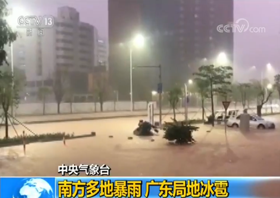 中央氣象臺監(jiān)測顯示,昨天廣東、廣西、福建、江西、湖南等地部分地區(qū)出現(xiàn)暴雨或大暴雨;廣東中部和珠江口附近還伴有8~10級雷暴大風(fēng),局地出現(xiàn)冰雹。