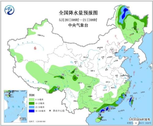 5月20日08時至21日08時,內(nèi)蒙古東部、東北地區(qū)北部、西藏東南部、福建東部和南部、廣東大部、廣西東南部、海南島東部、臺灣島等地有中到大雨。其中,內(nèi)蒙古東部、黑龍江西北部、福建東部、廣東西南部、海南島東部、臺灣島西北部等地局地有暴雨(50~93毫米)