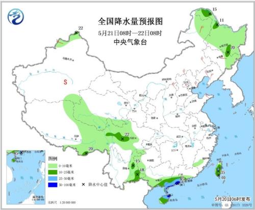 全國降水量預(yù)報圖(5月20日08時-21日08時)