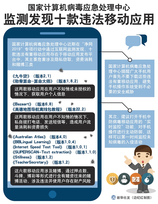 新華社天津5月28日電(記者張建新)國家計(jì)算機(jī)病毒應(yīng)急處理中心近期在“凈網(wǎng)2019”專項(xiàng)行動中通過互聯(lián)網(wǎng)監(jiān)測發(fā)現(xiàn),十款違法有害移動應(yīng)用存在于移動應(yīng)用發(fā)布平臺中,其主要危害涉及隱私竊取、資費(fèi)消耗和賭博三類。