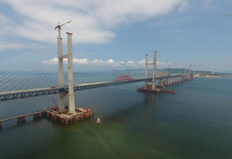 6月5日,施工中的福平鐵路平潭海峽公鐵兩用大橋(新華社記者林善傳 攝)
