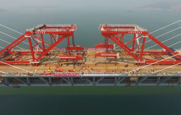 6月5日,福平鐵路平潭海峽公鐵兩用大橋元洪航道橋主橋成功合龍。(新華社記者林善傳攝)
