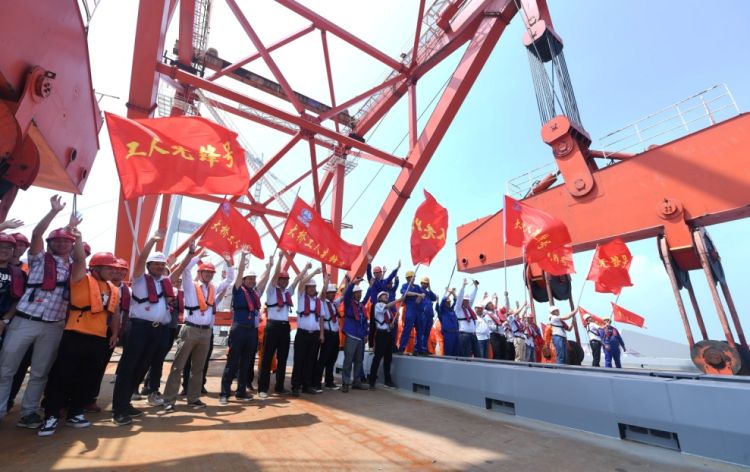 6月5日,福平鐵路平潭海峽公鐵兩用大橋元洪航道橋主橋成功合龍后,員工欣喜慶祝。(新華社記者林善傳 攝)