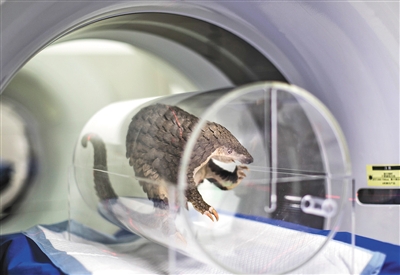 3月底,廣東野生動物救護中心接收了一批由海關(guān)查沒的走私穿山甲。圖為一只被救護的穿山甲在動物醫(yī)院做CT檢查。受訪者供圖