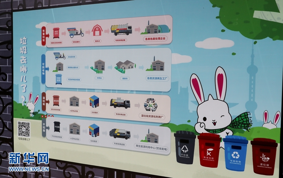 在虹口區(qū)嘉興路街道“宇泰景苑”小區(qū)內,小區(qū)垃圾房外的裝飾墻上對分類后不同垃圾的去向進行詳解(6月24日攝)。 新華社記者 方喆 攝