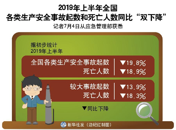 新華社北京7月4日電(記者魏玉坤、葉昊鳴)記者4日從應(yīng)急管理部獲悉,據(jù)初步統(tǒng)計,今年上半年,全國各類生產(chǎn)安全事故起數(shù)和死亡人數(shù)同比分別下降19.8%和18.9%,較大事故起數(shù)和死亡人數(shù)同比分別下降13.9%和18.3%。