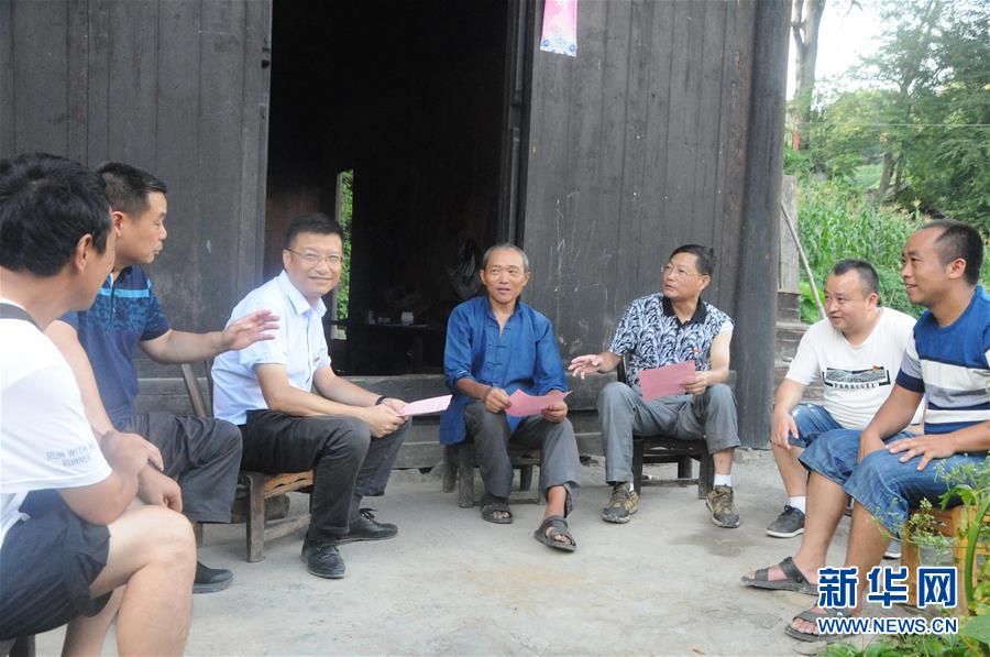 干部在湖南省古丈縣翁草村貧困戶龍自立家介紹安吉“白葉一號”項(xiàng)目情況(2018年7月11日攝)。新華社發(fā)