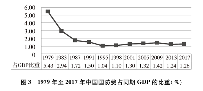 改革開放以來,中國國防開支經(jīng)歷了從維持性投入到適度增長的發(fā)展歷程,總體保持與國家經(jīng)濟和財政支出同步適度協(xié)調(diào)增長。國防費占國內(nèi)生產(chǎn)總值(GDP)比重從1979年最高的5.43%下降到2017年的1.26%,近30年一直保持在2%以內(nèi)。1979年國防費占國家財政支出比重為17.37%,2017年為5.14%,下降超過12個百分點,總體下降趨勢明顯。