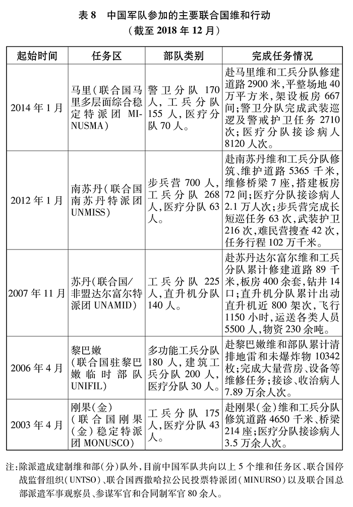 中國積極支持聯(lián)合國維和行動,是聯(lián)合國維和行動的主要出資國之一,是安理會常任理事國中第一大出兵國。截至2018年12月,中國軍隊已累計參加24項聯(lián)合國維和行動,派出維和軍事人員3.9萬余人次,13名中國軍人犧牲在維和一線。中國軍隊在維和任務(wù)區(qū)新建、修復道路1.3萬余千米,排除地雷及各類未爆物10342枚;運送物資135萬余噸,運輸總里程1300萬余千米;接診病人17萬余人次;完成武裝護衛(wèi)、長短途巡邏等任務(wù)300余次。