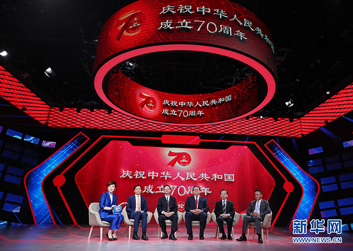 8月22日上午,由中央宣傳部、中央和國(guó)家機(jī)關(guān)工委、中央軍委政治工作部、北京市委聯(lián)合主辦,人民網(wǎng)、新華網(wǎng)、央視網(wǎng)承辦的慶祝中華人民共和國(guó)成立70周年系列論壇第二場(chǎng)在新華網(wǎng)媒體創(chuàng)意工場(chǎng)MR智能演播室舉行。圖為企業(yè)家與網(wǎng)友互動(dòng)。新華網(wǎng) 焦鵬 攝