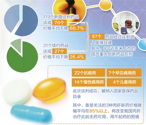 記者了解到,22個(gè)抗癌藥、7個(gè)罕見病用藥、14個(gè)慢性病用藥、4個(gè)兒童用藥此次談判成功,被納入國(guó)家醫(yī)保藥品目錄。其中,備受關(guān)注的3種丙肝新藥價(jià)格降幅平均在85%以上,將改變我國(guó)丙肝治療此前無藥可用、用不起藥的困境。
