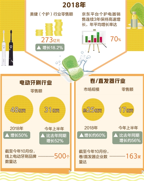 中國家用電器協(xié)會(huì)美?。▊€(gè)護(hù))電器專業(yè)委員會(huì)調(diào)查數(shù)據(jù)顯示,2018年美健(個(gè)護(hù))行業(yè)零售額273億元,增長18.2%。今年上半年,電動(dòng)剃須刀、電吹風(fēng)、卷/直發(fā)器和電動(dòng)牙刷4個(gè)品類零售額增速近40%;其中,卷/直發(fā)器和電動(dòng)牙刷兩類產(chǎn)品零售額增速是亮點(diǎn),均超過50%,市場正處于成長期。