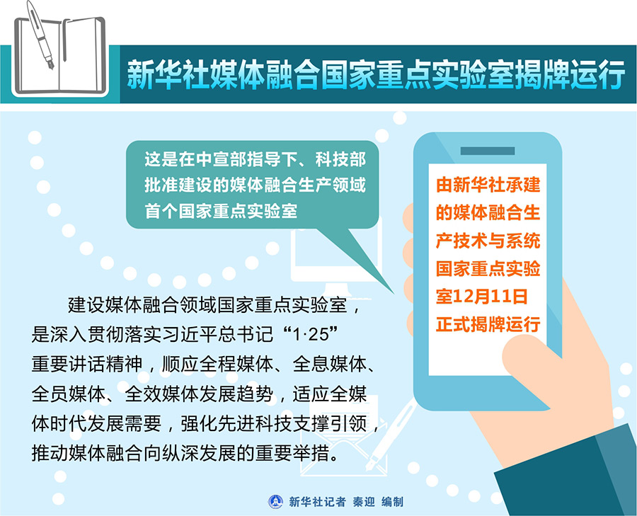 新華社北京12月11日電? 由新華社承建的媒體融合生產(chǎn)技術與系統(tǒng)國家重點實驗室12月11日正式揭牌運行。這是在中宣部指導下、科技部批準建設的媒體融合生產(chǎn)領域首個國家重點實驗室。建設媒體融合領域國家重點實驗室,是深入貫徹落實習近平總書記“1·25”重要講話精神,順應全程媒體、全息媒體、全員媒體、全效媒體發(fā)展趨勢,適應全媒體時代發(fā)展需要,強化先進科技支撐引領,推動媒體融合向縱深發(fā)展的重要舉措。