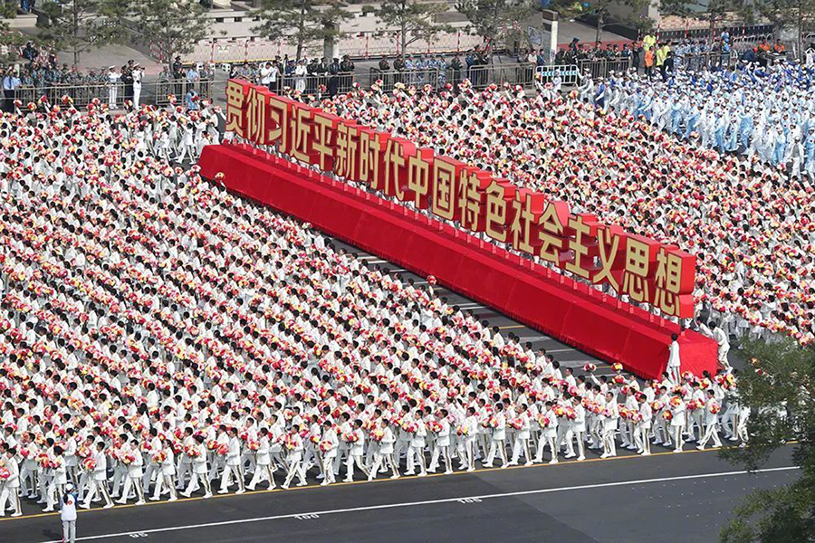 習(xí)近平總書記驅(qū)車行進(jìn)至受閱部隊(duì)最前方,面向旗幟行注目禮。