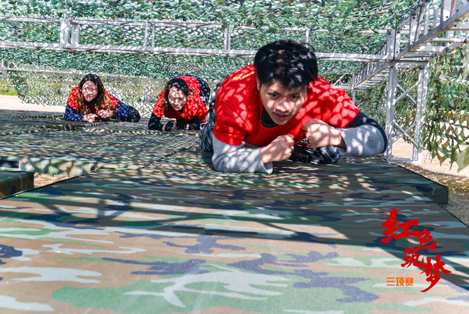 上午九時(shí),一支隊(duì)伍正合力將長(zhǎng)繩和70面國(guó)旗串聯(lián)懸掛至旗海中,讓人聯(lián)想起第一面五星紅旗在開(kāi)國(guó)大典廣場(chǎng)上飄揚(yáng)的場(chǎng)景;另一支隊(duì)伍的幾位隊(duì)員正用PVC管作為連接,合力吹氣將5個(gè)氫氣球吹爆,這是在通過(guò)游戲的形式致敬1967年的第一顆氫彈爆炸成功;還有一群隊(duì)員穿著救生衣、膠鞋扛著自己的隊(duì)友穿越洪水區(qū)、獨(dú)木橋區(qū)、沼澤地區(qū),還原98 年抗洪搶險(xiǎn)、5.12抗震救災(zāi)的場(chǎng)景……