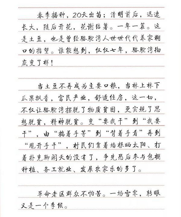 回憶起當(dāng)時(shí)的情景,顧寶青至今心里暖暖。分紅這天,顧寶青特意蒸了一鍋土豆,剛從屜上揭下,熱氣騰騰的,像極了駱駝灣現(xiàn)在的好生活……
