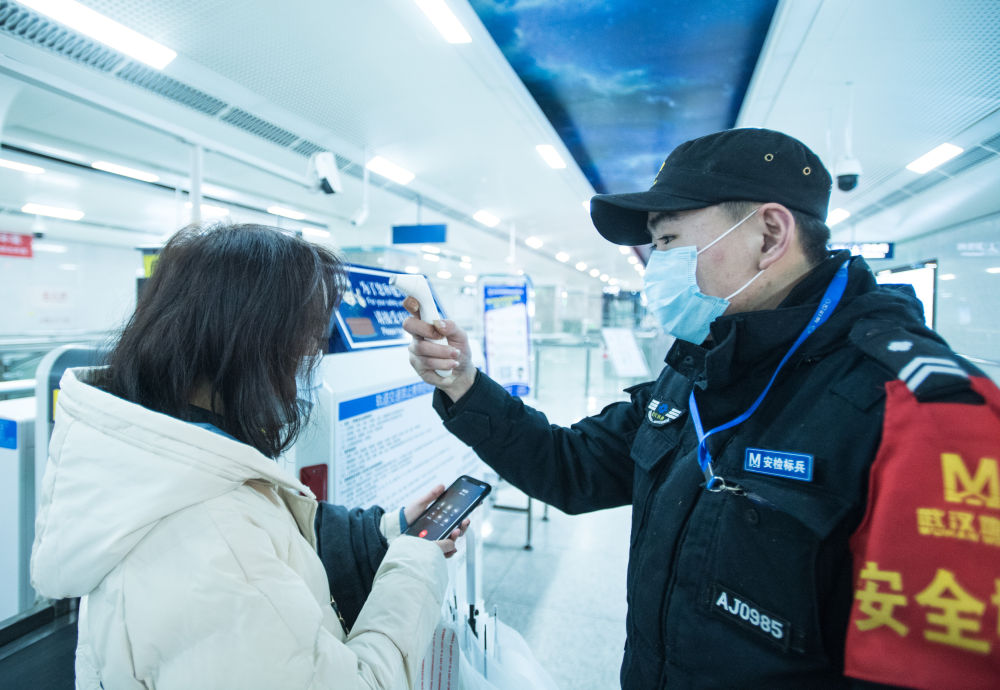 1月23日上午9時許,在武漢地鐵8號線汪家墩站,工作人員對旅客進(jìn)行體溫檢測。(新華社記者 肖藝九 攝)