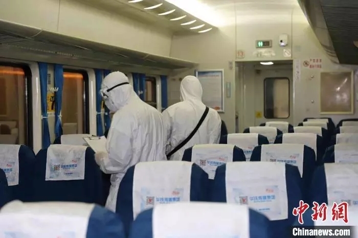 在車上,廣州鐵路疾控中心工作人員正全副武裝對(duì)列車進(jìn)行全面消毒。帶隊(duì)作業(yè)的廣州鐵路疾控中心主任楊裕楨介紹:“根據(jù)目前疫情的情況,我們的工作整體上包括消毒、檢疫、防護(hù)和保障有四大塊?!睋?jù)介紹,鐵路部門(mén)按照屬地政府的工作安排,采取預(yù)防性消毒、隨車消毒和終末消毒等方式,每日對(duì)候車室、旅客列車進(jìn)行消毒。加強(qiáng)車站和旅客列車空調(diào)通風(fēng)設(shè)施檢查、維修和消毒,做好候車室和旅客列車通風(fēng)換氣,保持室(車)內(nèi)空氣清新。