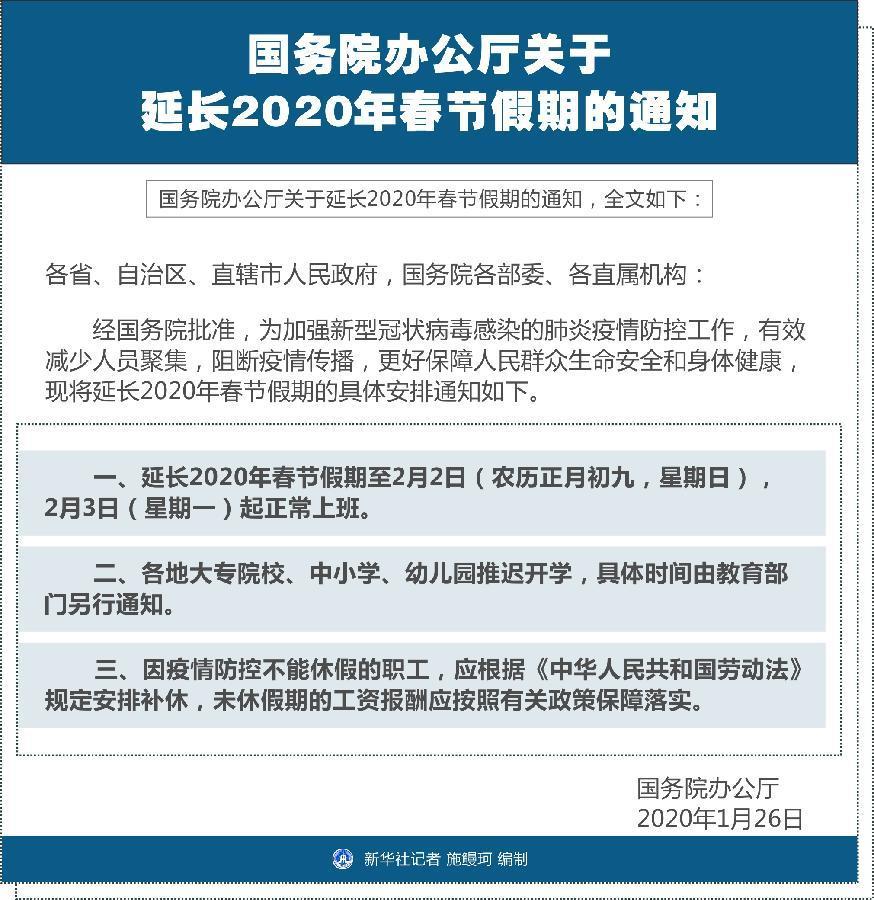 經(jīng)國務(wù)院批準(zhǔn),為加強(qiáng)新型冠狀病毒感染的肺炎疫情防控工作,有效減少人員聚集,阻斷疫情傳播,更好保障人民群眾生命安全和身體健康,現(xiàn)將延長2020年春節(jié)假期的具體安排通知如下。