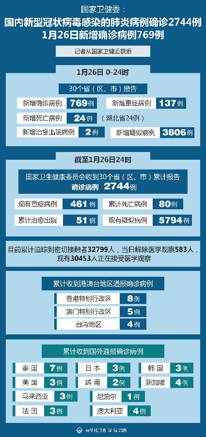 截至1月26日24時(shí),國(guó)家衛(wèi)生健康委員會(huì)收到30個(gè)省(區(qū)、市)累計(jì)報(bào)告確診病例2744例,現(xiàn)有重癥病例461例,累計(jì)死亡病例80例,累計(jì)治愈出院51例。現(xiàn)有疑似病例5794例。
